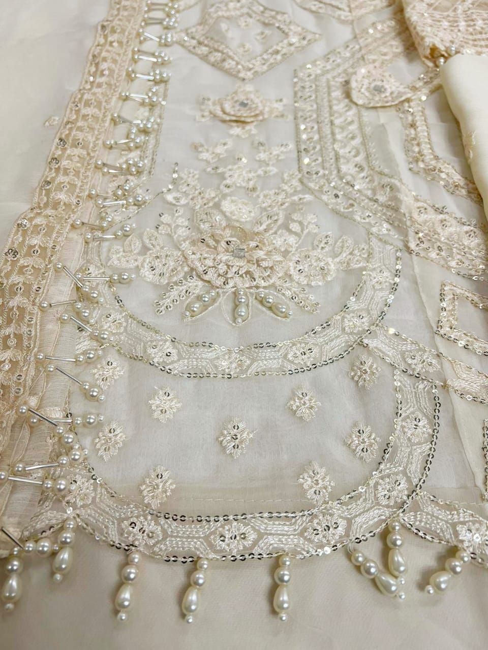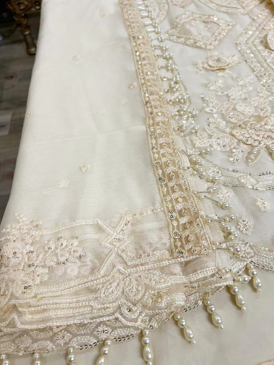 * Front: Chiffon embroidered sequence 3d flowers alternate* Daman: Embroidered & Tussels attached * Back: Chiffon Embroidered sequence * Daman: Embroidered patch* Sleeves: Chiffon Embroidered & Cuff Emb patch* Trouser: Dyed Malai* Dupatta: Chiffion Embroidered ready to wear