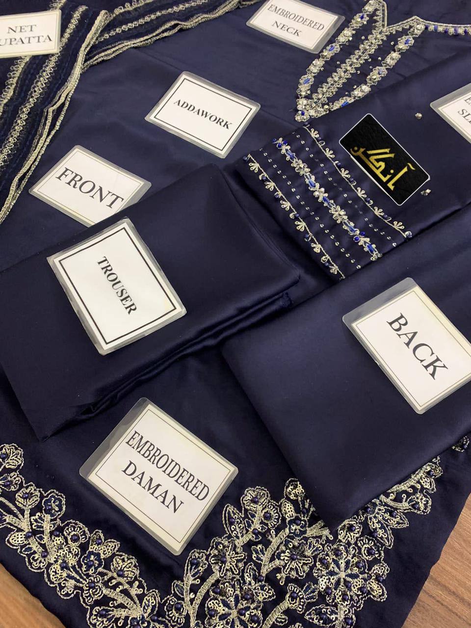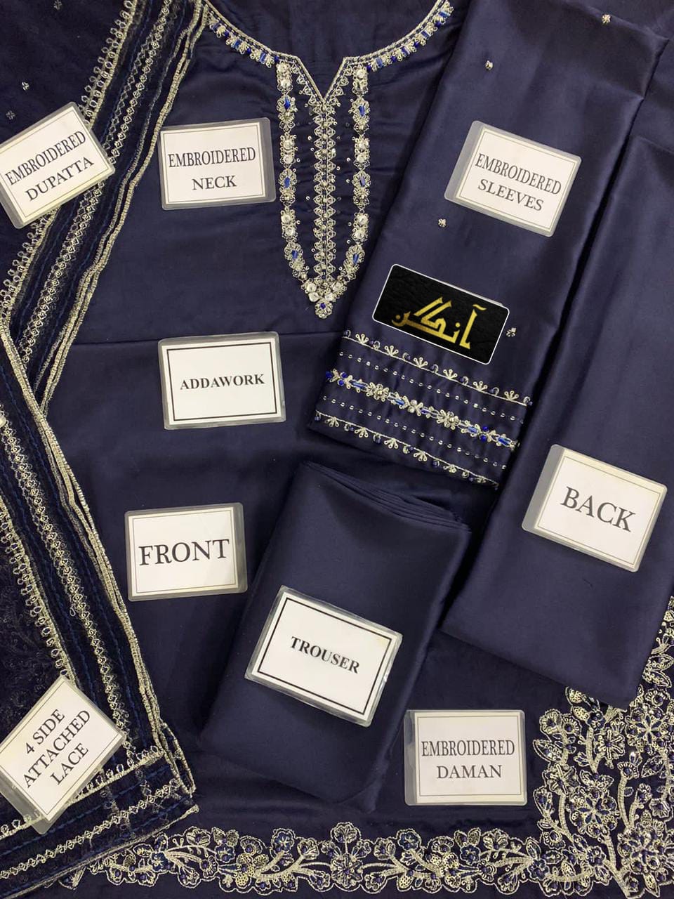 * Shirt: Embroidered Shamooz Silk * Neck: Hand Embellished stone work on fabric * Sleeves: Embroidered adda work * Trouser: Pure silk * Dupatta: Net Embroidered ready to wear
